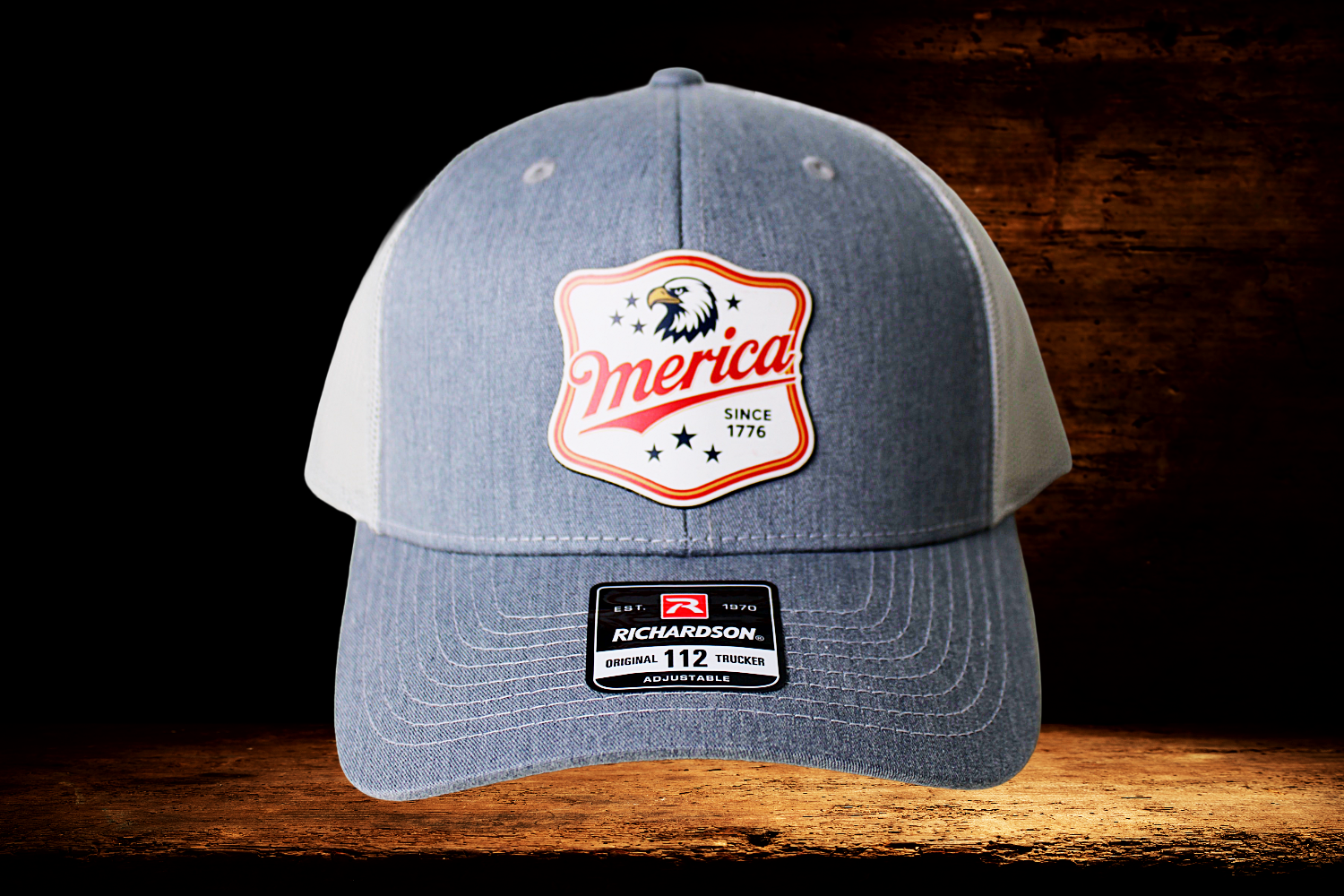 Richardson 112 heather gray and white with 'Merica and eagle patch