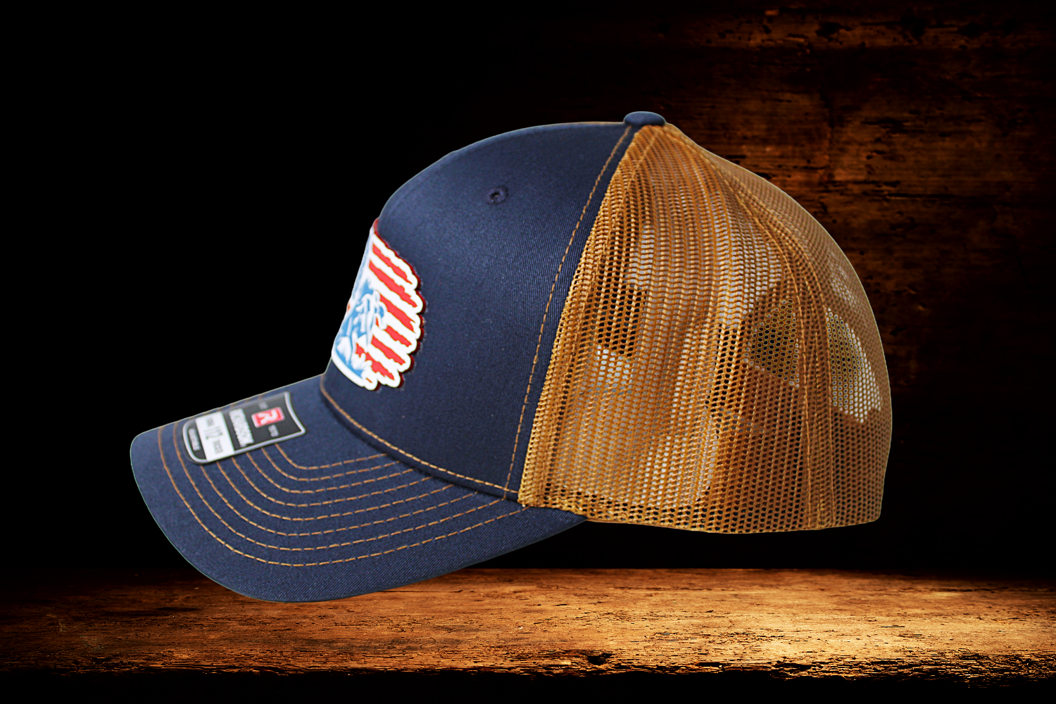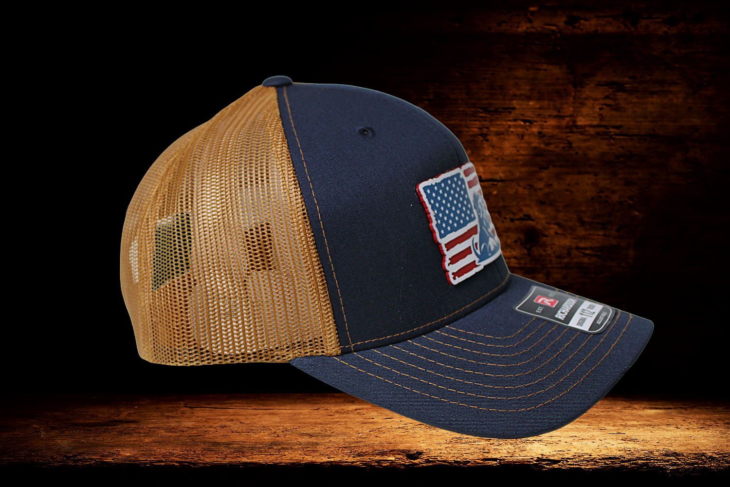 Richardson 112 in Navy and Tan, Retriever with duck in mouth on American flag background.